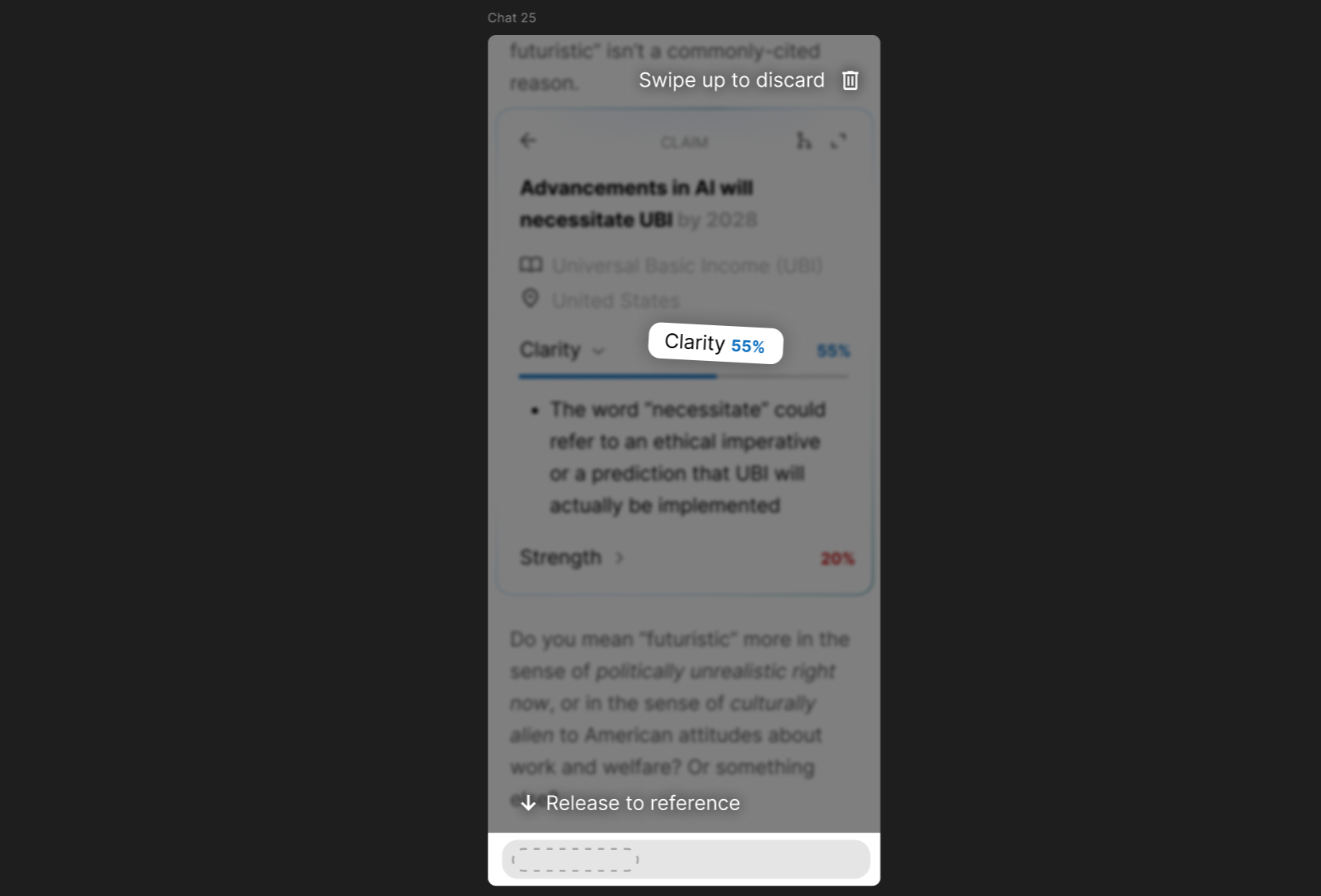 It should be possible to add most UI elements to the chat in order to ask questions about them or make claims about them. You could do this by dragging to the right on an element in order to “detach” it. Or perhaps you click and hold. On iOS you could hard press. Or you could use a toggle somewhere on the screen, perhaps under the input bar on the bottom right which, when enabled, revealed all the elements that can be dragged into the chat. In this case, it would toggle itself off again as soon as you grab something. It would be similar to the MIDI map mode in Ableton.